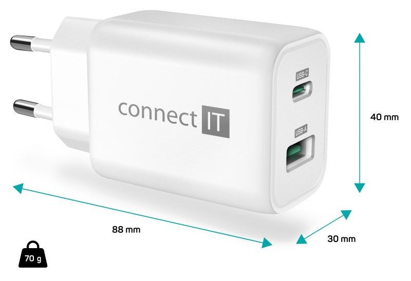 CONNECT IT Wanderer2 GaN nabíjecí adaptér 1×USB-C + 1xUSB-A, 33W PD, bílá