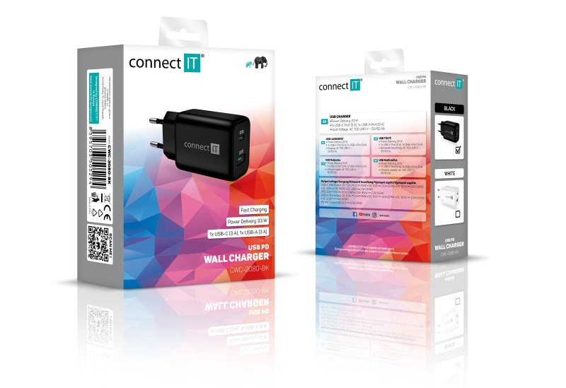 Cestovná USB nabíjačka CONNECT IT "Wanderer2" s technológiou GaN, určená na napájanie a nabíjanie mobilných telefónov, tabletov, power bankov, akčných kamier, elektronických čítačiek kníh, MP3 a MP4 prehrávačov, herných konzol a mnohých ďalších prenosných zariadení doma, v kancelárii aj na cestách. Technológia Power Delivery (PD) umožňuje rýchlonabíjanie s výkonom 33 W.