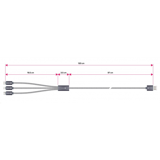 Univerzálny nabíjací kábel 3 v 1 na nabíjanie zariadení s konektormi Micro USB, Lightning a USB-C (typ C) umožňuje nabíjať až tri zariadenia súčasne s podporou rýchleho nabíjania pomocou max. prietok prúdu 2 A