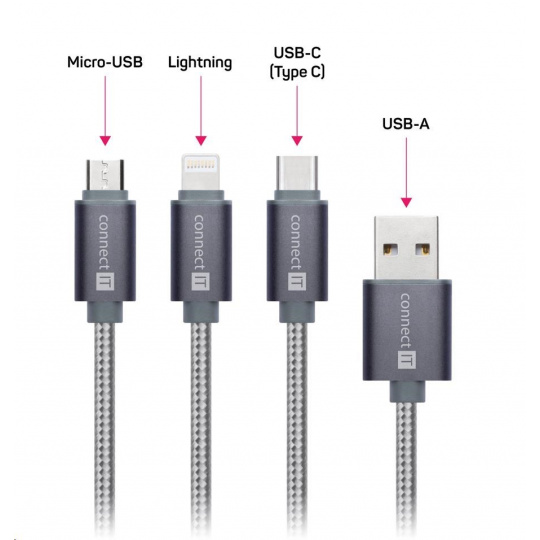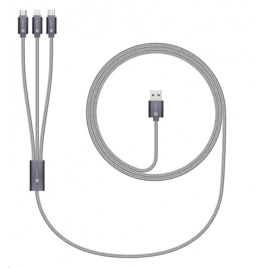 CONNECT IT Wirez 3v1 USB-C & Micro USB & Lightning, strieborná sivá, 1,2 m