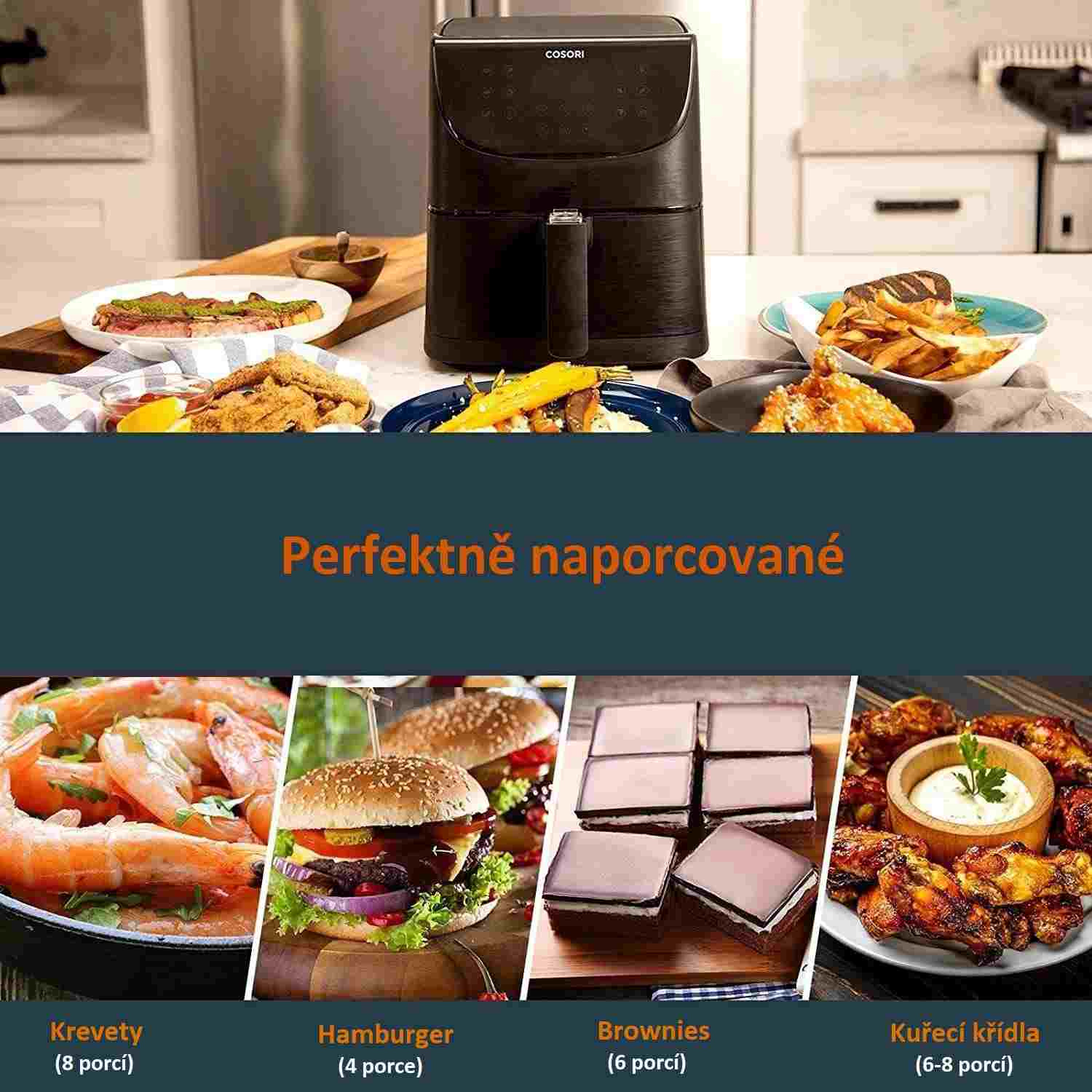 S teplovzdušnou fritézou COSORI CP158-AF PREMIUM si môžete užiť vaše obľúbené vyprážané jedlá bez výčitiek, pretože na rozdiel od bežného vyprážania alebo fritovania je možné v nej pripravovať jedlá za použitia veľmi malého množstva oleja alebo vôbec žiadneho. Kombinácia cirkulujúceho horúceho vzduchu, dokonalej teploty varenia a chytrých programov zaistí, že hranolky budú vždy krásne chrumkavé a kuracie stehná šťavnaté. Či už je vaše jedlo čerstvé alebo mrazené, stlačením tlačidla môžete horúcim vzduchom smažiť kuracie krídla, kuracie prsia, sladké zemiaky, steaky, čerstvé hranolky a mnoho ďalšieho. Až budete mať hotovo, čistenie bude rovnako jednoduché vďaka nepriľnavému košu, ktorý je možné umývať v umývačke. Vďaka veľkej nádobe s objemom 5,5 l navyše dokážete rýchlo navariť aj pre väčšiu rodinu alebo skupinu hostí.