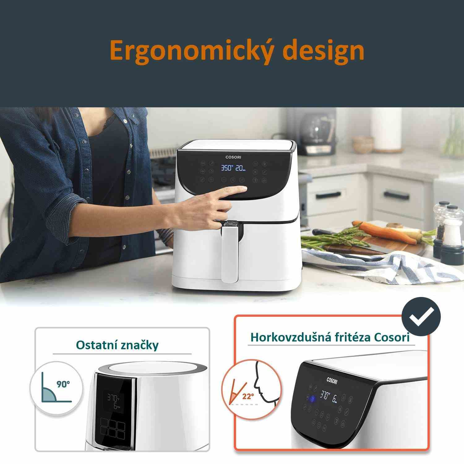 Dizajn teplovzdušnej fritézy COSORI CP158-AF bol navrhnutý v Kalifornii. Vďaka svojej praktickosti, funkciám, ovládaniu aj prehľadnému dotykovému naklonenému LED displeju sa ľahko prístupnými tlačidlami získal aj prestížne ocenenie Red Dot Award za najlepší dizajn.