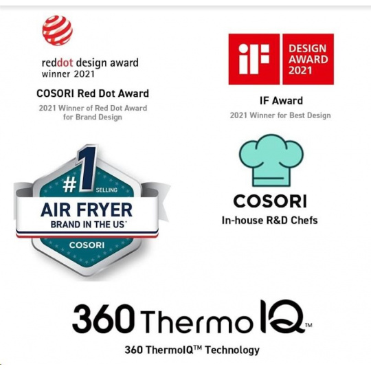 Dizajn teplovzdušnej fritézy COSORI CAF-P583S bol navrhnutý v Kalifornii. Vďaka svojej praktickosti, funkciám, ovládacím prvkom a prehľadnému naklonenému dotykovému LED displeju s ľahko prístupnými tlačidlami získal aj prestížne ocenenie Red Dot Award za najlepší dizajn.