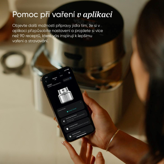 - Inteligentné ovládanie prostredníctvom aplikácie prináša recepty, plánovanie a plnú kontrolu priamo do vášho telefónu