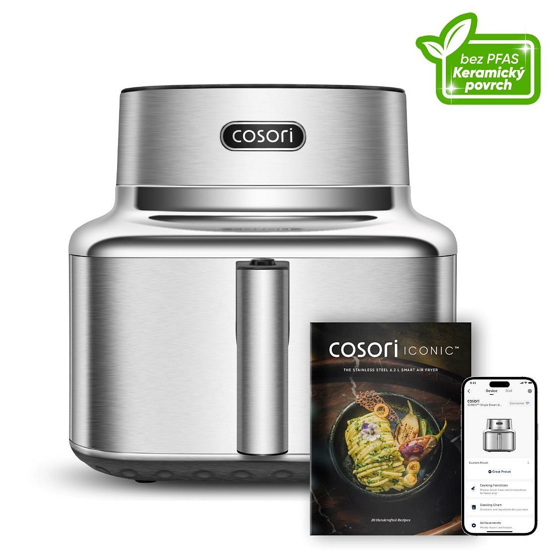 Súčasťou balenia je elegantná kuchárska kniha plná inšpirácie, dostupná aj v online českej verzii, ktorá vás krok za krokom prevedie zdravým varením. Predĺžená 5-ročná záruka*, testovaná životnosť 2000 hodín a odolnosť voči 300 cyklom umývania v umývačke riadu dokazujú, že Iconic je stvorený pre roky každodenného potešenia. To všetko v tele, ktoré vyzerá rovnako dobre, ako varí. COSORI Iconic nie je spotrebič – je to životný štýl, v ktorom sa dizajn, zdravie a výkon spájajú v dokonalej harmónii.