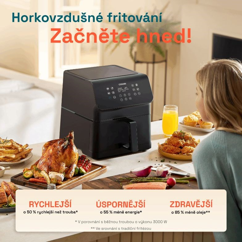 Predstavujeme teplovzdušnú fritézu Cosori P651 Premium II, inovatívne riešenie, ktoré šetrí nielen čas, ale aj energiu a ponúka spôsob varenia, ktorý je šetrný k zdraviu. S teplovzdušnou fritézou si môžete vychutnať svoje obľúbené jedlá pripravené s minimom oleja, vyhnete sa zápachu z vyprážania a čistenie je vďaka košu, ktorý možno umývať v umývačke riadu, hračkou. Fritéza ponúka kôš s veľkorysým objemom 6,2 litra, takže v nej pohodlne pripravíte jedlo pre 3 až 5 osôb, napríklad celé kurča s hmotnosťou 2,3 kg. Pri svojom veľkom objeme si však zachováva malé vonkajšie rozmery, takže je vhodná aj do malých kuchýň. Vďaka technológii 360° cirkulácie vzduchu sa fritéza zohreje na prevádzkovú teplotu do 5 minút, čím sa ešte viac skráti čas prípravy pokrmov. Malý objem znamená aj nízku spotrebu energie v porovnaní s bežnou rúrou. Fritéza ponúka 12 programov na prípravu pokrmov, ktoré možno nastaviť podľa individuálnych chutí. Displej fritézy je prehľadný a pohodlne naklonený pre dokonalú čitateľnosť. V dnešnej digitálnej dobe je atraktívna aj funkcia stlmenia tlačidiel. Ako bonus si môžete stiahnuť elektronickú kuchárku s 80 receptami v českom aj slovenskom jazyku.