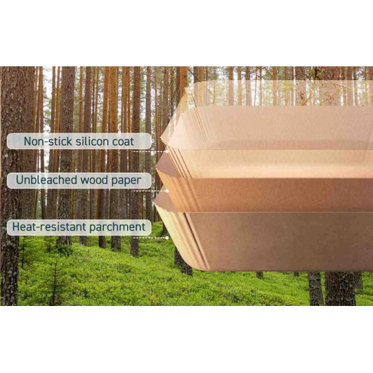 Papiere na pečenie COSORI sú vyrobené z netoxického a nebieleného potravinárskeho materiálu bez vosku a možno ich zahrievať až do 230 °C, čo je najvyššia teplota v teplovzdušnej fritéze.