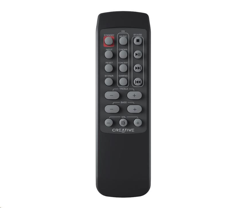 Vyberte si z předvoleného nastavení EQ pro filmy, hudby, koncert a herní režim pomocí dálkového ovládání, které je součástí balení. Kromě obvyklých ovládacích prvků pro zvuk a hlasitost dálkové ovládání nabízí také možnost zvýšení nebo snížení nastavení výšek a basů.