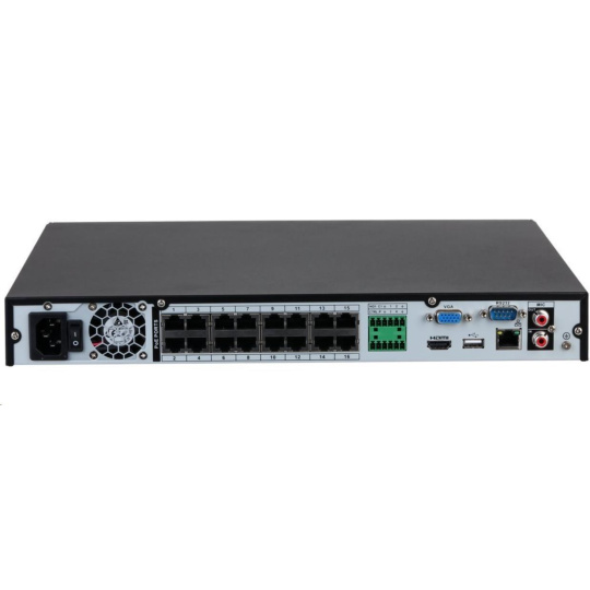 1× 10/100/1000 MbE RJ-45, 16× 10/100 Mbps RJ-45 PoE (IEEE 802.3 af/at), 1× audio vstup (RCA), 1× audio výstup (RCA), 4× alarm vstup, 2× alarm výstup, 2× USB 2.0, pozícia pre 2× SATA HDD (max. 20 TB/disk), 1× HDMI, 1× VGA, 1× RS-232.