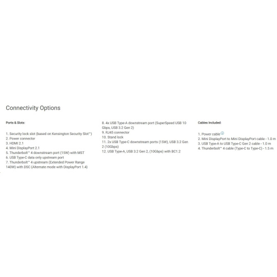 | 1. Power cable 2. Mini DisplayPort to Mini DisplayPort cable - 1.0 m 3. USB Type-A to USB Type-C Gen 2 cable - 1.0 m 4. Thunderbolt™ 4 cable (Type-C to Type-C) - 1.5 m |