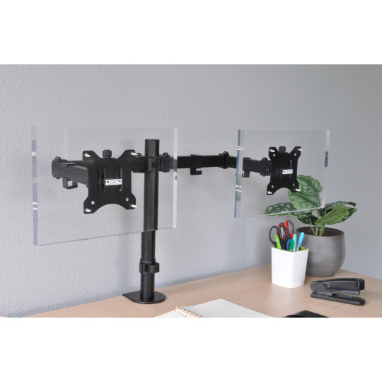 Maximalizujte svoj pracovný priestor s DESQ Dvojitým ramenom na monitor, ideálnym pre domácu kanceláriu, prácu, gaming alebo štúdium. Táto ergonomická možnosť umožňuje presné nastavenie výšky, uhla a rotácie monitorov, čím zvyšuje komfort a efektivitu práce. ? Montáž pomocou C-Clamp + Desk-thru pre flexibilné a bezpečné uchytenie ? Jemné nastavenie výšky každého monitoru pomocou regulačného skrutky ? Rýchloupínacia VESA doska pre jednoduchú inštaláciu monitorov ? Kompatibilné s monitorami od 17” do 32” (VESA 75x75 mm a 100x100 mm) ? Nosnosť 9 kg na každé rameno – spoľahlivá podpora väčšiny monitorov ? Možnosť ľahkej rotácie medzi režimom na výšku a na šírku ? Držiak na imbusové kľúče – nástroje vždy po ruke S DESQ dvojitým ramenom na monitor si nastavíte výšku, vzdialenosť a uhol monitorov presne podľa vašich potrieb. To pomáha znížiť namáhanie krku, chrbta a očí a zároveň uvoľniť cenný priestor na stole.