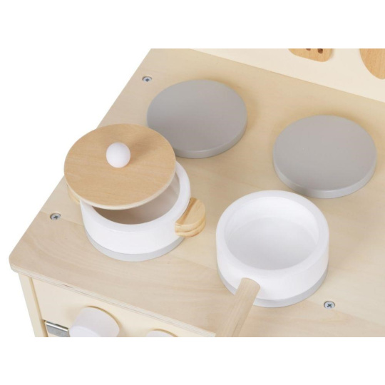 Detská kuchynka v jemných pastelových farbách, so spotrebičmi, príslušenstvom a okienkom, nadchne každého malého kuchára a gazdinku. V detskej kuchynke si deti môžu vyskúšať varenie, pečenie, umývanie riadu, chystanie pokrmov bezpečným detským spôsobom. Pri hre v detskej drevenej kuchynke si deti zdokonalia svoje zručnosti a ešte si užijú veľa zábavy.