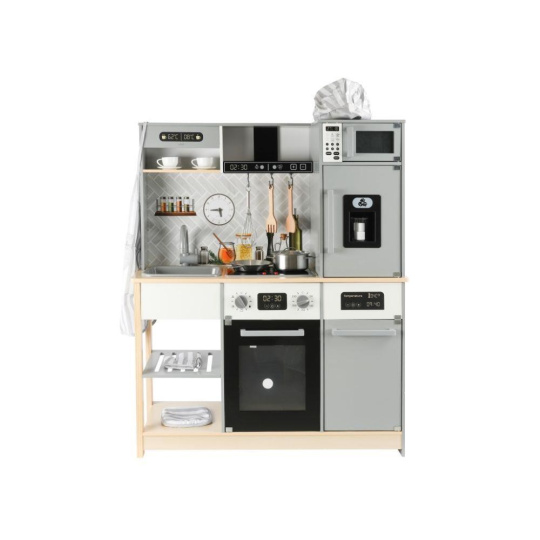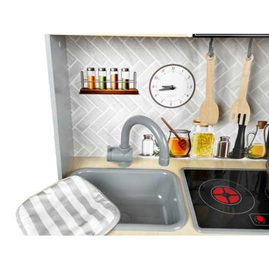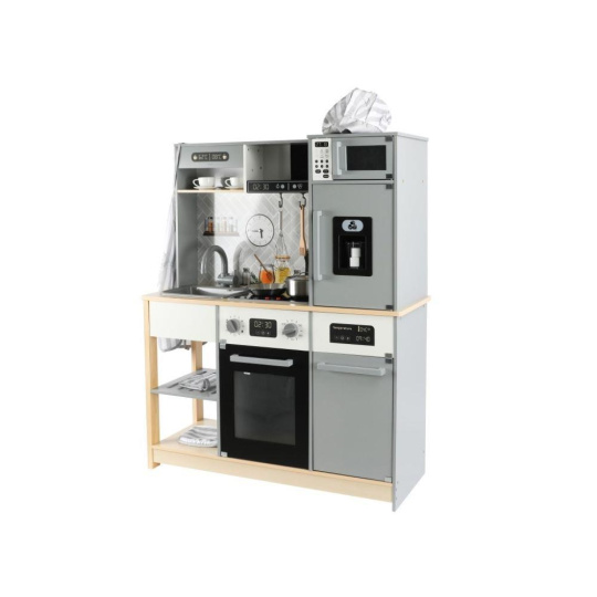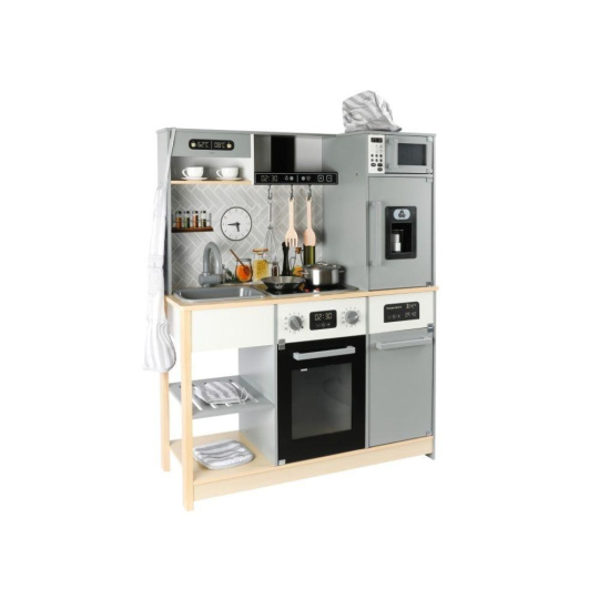 Detská kuchynka vybavená modernými spotrebičmi, doplnená o bohaté príslušenstvo a textilný kuchársky set ZDARMA, očarí dievčatá aj chlapcov. Drevená kuchynka v škandinávskom štýle je vhodná do každej miestnosti. Vďaka tejto krásnej edukačnej hračke si deti vyskúšajú varenie, pečenie, chystanie jedál, umývanie riadu a ďalšie činnosti bezpečným detským spôsobom. Pri hre v modernej kuchynke deti zdokonalia svoje zručnosti a zároveň si užijú veľa zábavy.