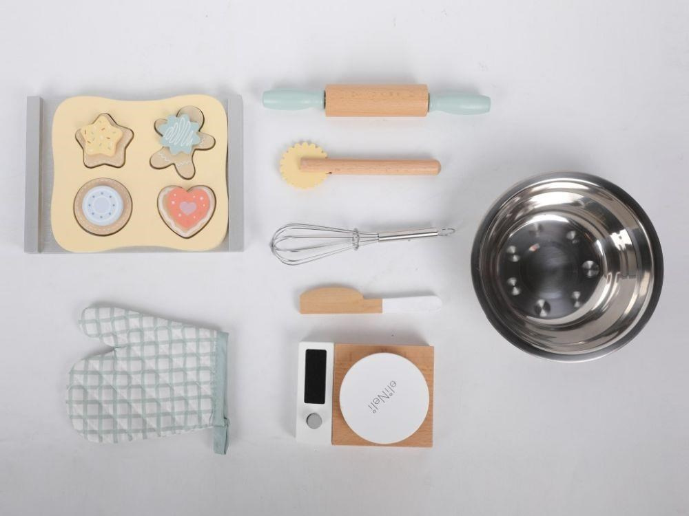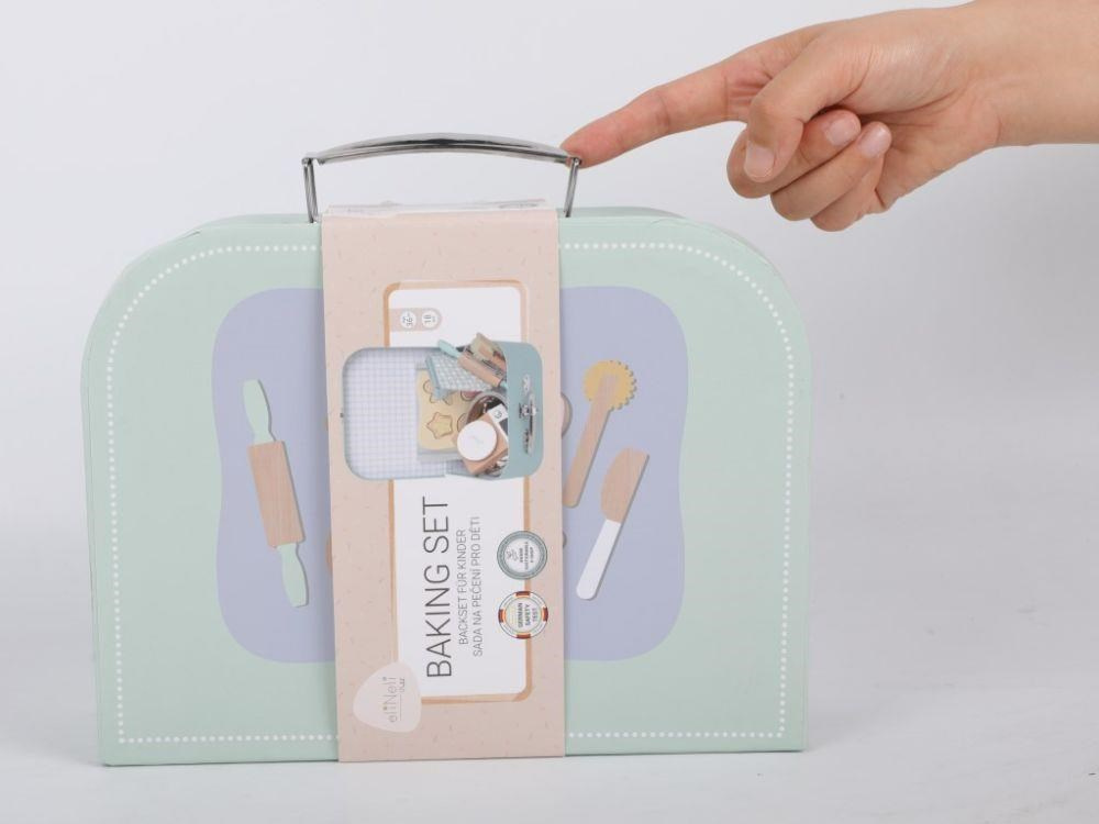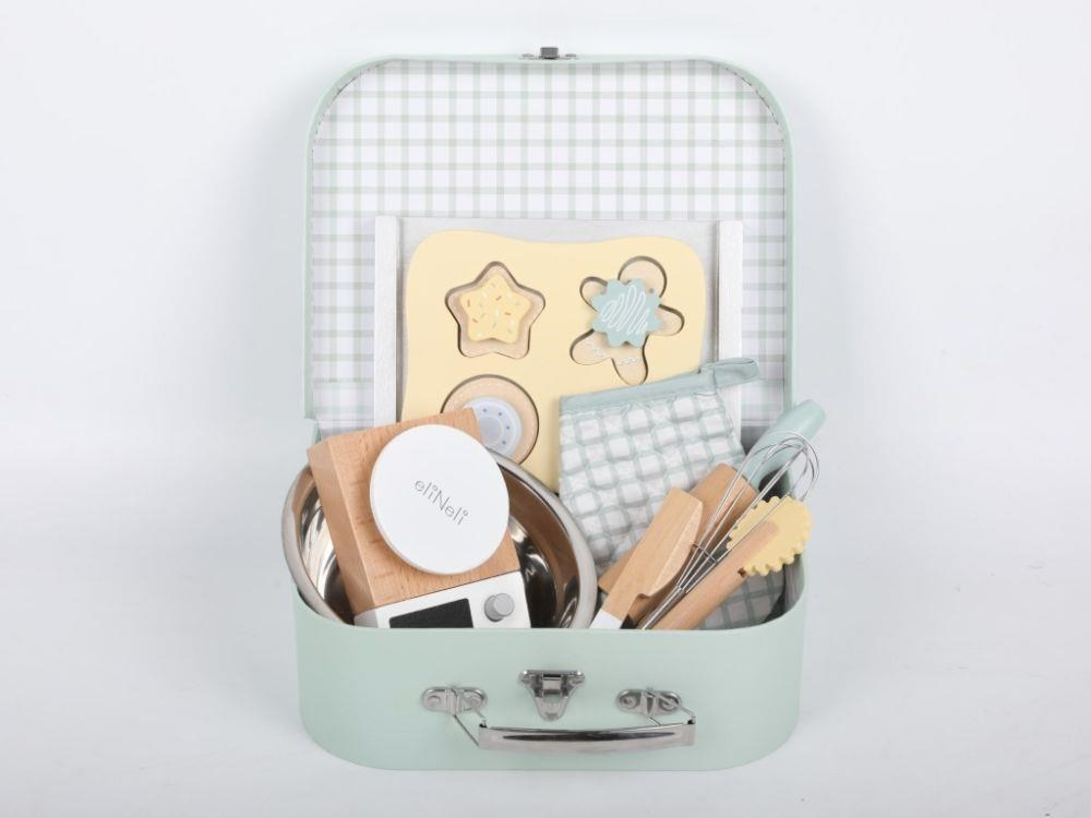 Detská sada na pečenie uložená v praktickom kufríku umožní deťom piecť perníčky a sušienky kdekoľvek sa im zachce - v kuchyni, v detskej izbe, detskej kuchynke, v záhradnom domčeku a pokojne aj na návšteve u kamaráta alebo babičky, bezpečným detským spôsobom. Obsahuje všetko potrebné na upečenie lahodnej svačinky, kuchynskú váhu, nádobie, náčinie, cesto aj rukavicu. Kufrík umožní deťom celú sadu rýchlo upratať aj preniesť.