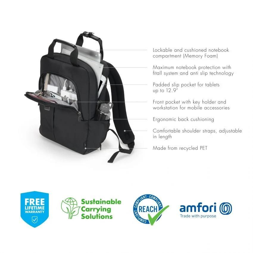 DICOTA is an official participant in the Microsoft Designed for Surface program, which certifies exceptional accessories created by third-party manufacturers to work seamlessly with Surface devices. The lockable notebook compartment is equipped with memory foam and automatically adjusts to Microsoft Surface devices up to 15" thanks to the fit-all system. Optimal hold is provided by the anti-slip technology coating, which prevents the device from slipping out of the backpack. Best protection for tablets up to 12.9 inches. The front pocket with key ring and pockets keeps your personal items tidy and has room for additional mobile accessories. Maximum carrying comfort thanks to ergonomic back padding, length-adjustable shoulder straps, comfortably shaped carrying handle and trolley fastening strap. Hidden zipped pocket on the back to safely store passport, wallet or other valuables. Side pockets for storing an umbrella or water bottle. The bottom of the bag is made from waterproof material. Made from 13 high-quality recycled PET bottles Compatible with any Surface Pro, Pro X, Laptop, Go, Laptop Go, Laptop SE, Book, Laptop Studio as well as Duo Slim design Lockable and padded Notebook compartment with fit-all system and non-slip technology Maximum security thanks to memory foam Notebook compartment for Surface devices up to 15" Padded slide-in pocket for tablets up to 12.9" Spacious front pocket with zipped pocket, key holder and workstation for accessories, plus power supply and cables Hidden zipped pocket for passport, wallet etc. Expandable side pocket for umbrella or water bottle Comfortable carrying handle Adjustable shoulder strap Ergonomic back padding Trolley belt Waterproof material at the bottom More Information More Information Item number D31820-DFS Color black Volume in liters 10 Material 900Dx600D rPET Warranty Lifetime / 30 years EAN 7640186417662 Max. Device Measurements (mm) 350 x 30 x 245 mm 13.78 x 1.18 x 9.65 inch Product Measurements (mm) 295 x 400 x 85 mm 11.61 x 15.75 x 3.35 inch Weight 0.96 kg / 2.11 lbs.