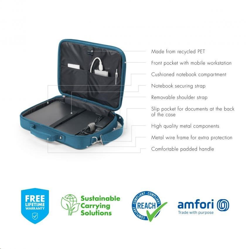 Kompaktné puzdro Eco Multi BASE ponúka ideálnu ochranu pre váš notebook vďaka polstrovanej priehradke na notebook. Puzdro plne chráni zariadenia od 14 do 15 rokov.6" a elastický popruh ich tiež upevňuje v priehradke. Základňa Eco Multi BASE zaručuje extra stabilitu a ochranu vďaka kovovému rámu, ako aj flexibilnú mobilitu vďaka ľahkej konštrukcii. Smartfón alebo iné menšie predmety, ako sú káble, perá alebo nabíjačky, si môžete uložiť do praktického predného vrecka, aby ste ich mali vždy po ruke. Vďaka rukovätiam sa kufor pohodlne prenáša a pomocou zabudovaného popruhu ho možno v priebehu niekoľkých sekúnd pripevniť ku kufru. Dá sa prenášať aj pomocou nastaviteľného ramenného popruhu. Eco Multi BASE je preto ideálny pre vás, ak ste vždy na cestách a chcete podporiť recykláciu PET fliaš ekologickým puzdrom.