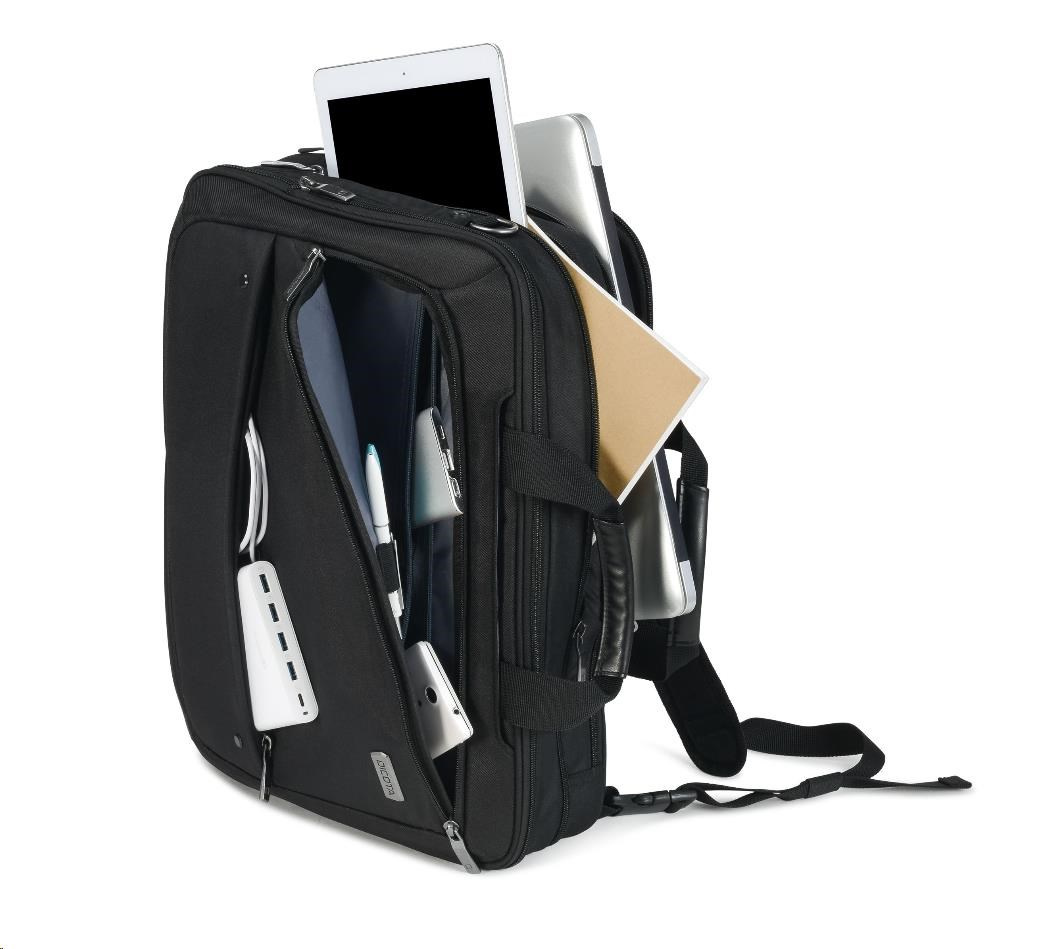 - Priestranná hlavná priehradka s úložným priestorom na dokumenty a polstrovaným zasúvacím vreckom na tablet do 10.5" (mäkký nylexový materiál)