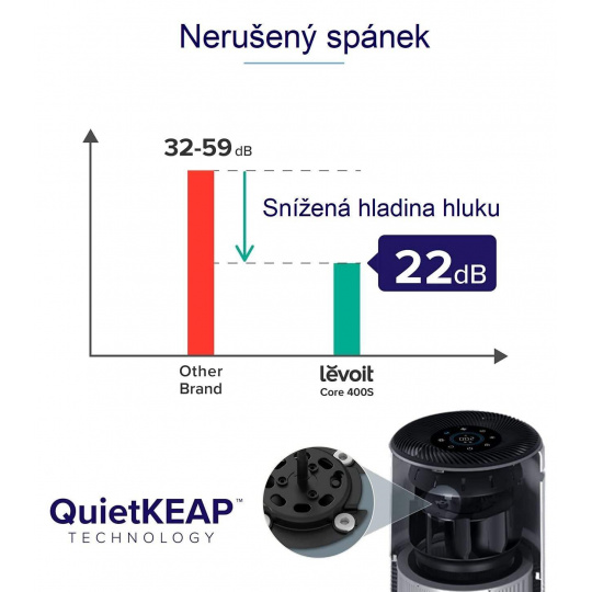 Vďaka patentovanej technológii QuietKEAPTM nebudete ani vedieť, že je čistička Levoit Vital 100S v prevádzke. Pre nerušený spánok bola navrhnutá špeciálna nočná prevádzka s hlasitosťou iba 23 dB. V nočnom režime sa tiež aktivuje tlmené osvetlenie alebo môžete svetlo úplne vypnúť. Táto nízka hlučnosť je výhodou voči čističkám vzduchu od iných výrobcov.