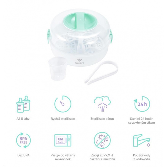 Ochrana imunitného systému vášho dieťaťa pre vás nemusí znamenať neustále vyvarenanie fľaštičiek a cumlíkov. So sterilizátorom do mikrovlnnej rúry TrueLife Invio MS5 sterilizujete detské fľaštičky, hryzátka a ďalšie predmety behom dvoch minút. Na to potrebujete len obyčajnú vodu a mikrovlnnú rúru. Sterilizátor využíva nemocničnú metódu parnej sterilizácie, ktorá je rýchla, účinná a bez chemických látok. Ničí tak 99,9 % baktérií a mikróbov, ktoré sa nachádzajú na detských predmetoch, bez poškodenia ich povrchu. Sterilizátor je navrhnutý pre väčšinu mikrovlnných rúier na trhu a zvládne väčšinu typov dojčenských fliaš. Pojme až 5 fľaštičiek naraz a ľahko sa ovláda. Vďaka kompaktnej veľkosti s ním môžete bez problémov cestovať.