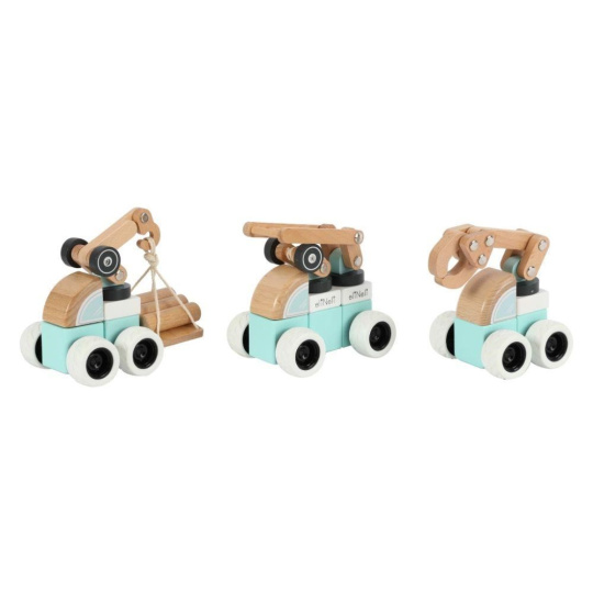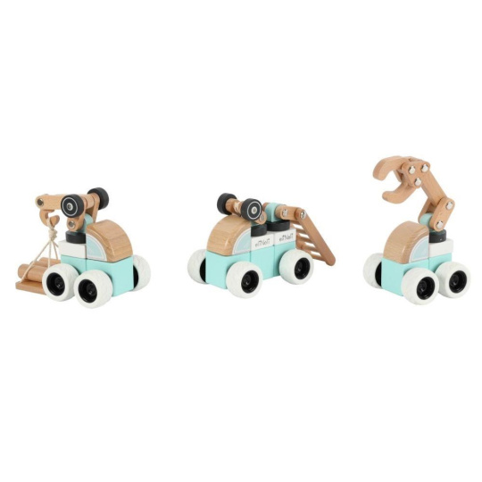 Sada drevených áut (strojov) ponúka množstvo možností na hranie. Každé auto je zostavené z kostiek v farbe bielej, mätej alebo v prírodnej farbe dreva a každé z áut obsahuje pohyblivú časť (pohybové rameno alebo rebrík) pre ešte viac zábavy. Auta sú vyrobené tak, aby dobre padli do detskej ruky, pohodlne sa držali a ľahko s nimi manipulovalo. Gumené kolesá tlmia hluk a šetria podlahu.