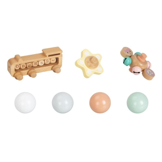 Již zmontovaná drevená guľôčková dráha XL, z tvrdého prírodného dreva, s 6 drevenými zábavnými prvkami a s parádnym vláčikom ZDARMA je zábavnou hračkou pre deti aj celú rodinu. Stačí správne umiestniť jeden z drevených doplnkov (guľôčku, kytičku, koliesko s rolničkami, vláčik) do horného poschodia a sledovať, čo sa bude diať. Hra s guľôčkovou dráhou zdokonaľuje zručnosti, učí deti sústrediť sa a trpezlivosti, niektoré prvky stimulujú zmysly a naučia deti písmenká. Guľôčkovú dráhu nemusíte skladať, je už zmontovaná.