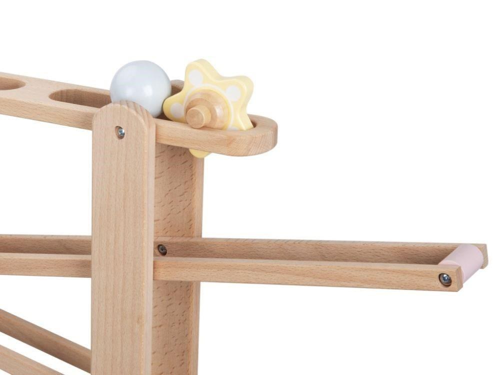 Již zmontovaná drevená guľôčková dráha XL, z tvrdého prírodného dreva, s 6 drevenými zábavnými prvkami a s parádnym vláčikom ZDARMA je zábavnou hračkou pre deti aj celú rodinu. Stačí správne umiestniť jeden z drevených doplnkov (guľôčku, kytičku, koliesko s rolničkami, vláčik) do horného poschodia a sledovať, čo sa bude diať. Hra s guľôčkovou dráhou zdokonaľuje zručnosti, učí deti sústrediť sa a trpezlivosti, niektoré prvky stimulujú zmysly a naučia deti písmenká. Guľôčkovú dráhu nemusíte skladať, je už zmontovaná.