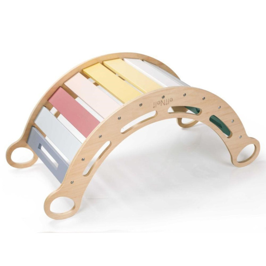 Veľká drevená Montessori hojdačka 6v1, v sete so špeciálnym obojstranným doskou a stoličkou, vám umožní vytvoriť dúhový set detského nábytku (stôl so stoličkou) takmer kdekoľvek. Rovnakou ľahkosťou tento set premeníte na malé detské ihrisko so šmýkačkou alebo lezeckou stenou. Multifunkčná Montessori hojdačka max umožní deťom príjemne sa pohupovať, môže byť lezeckou, šmýkačkou, skrýšou, mostom, s ďalšími časťami setu stolíčkom alebo detským ihriskom. Pastelový set je vhodný pre deti už od 1 roka.