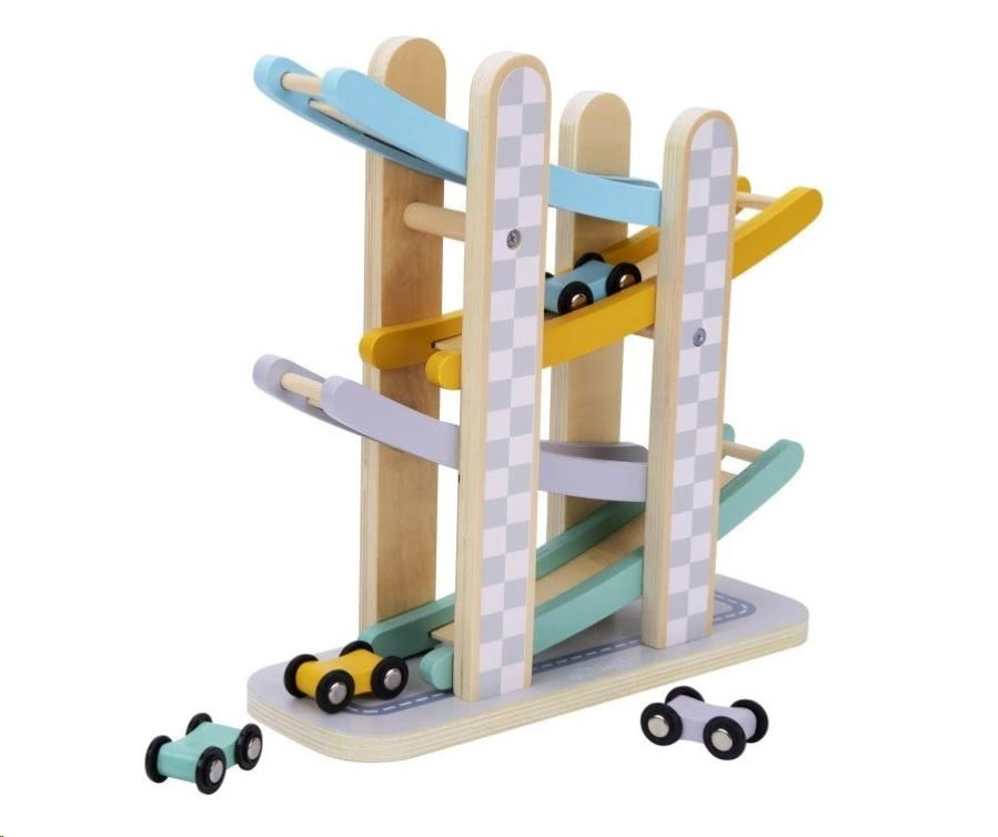 Závodná dráha so 4 závodnými autíčkami pre deti, vyrobená z prírodného dreva, v jemných pastelových farbách, je zábavnou hračkou pre chlapcov, dievčatá aj celú rodinu. Stačí správne položiť jedno zo závodných autíčok na začiatok závodnej dráhy (na najvyššie patro autodráhy) a potom sledovať, s akou úžasnou rýchlosťou prekoná všetky nižšie patra, až dorazí do úplného cieľa. Pri hre s autodráhou si deti precvičia jemnú motoriku, koordináciu očí a rúk, sústredenie, trpezlivosť a prebúdzajú v sebe prirodzenú súťaživosť. Zorganizujte u vás doma preteky, pri ktorých si užijete veľa zábavy. Zo závodných autíčok v krásnych farbách si svojho favorita vyberie každý, stačí vziať stopky do ruky a preteky môžu začať.