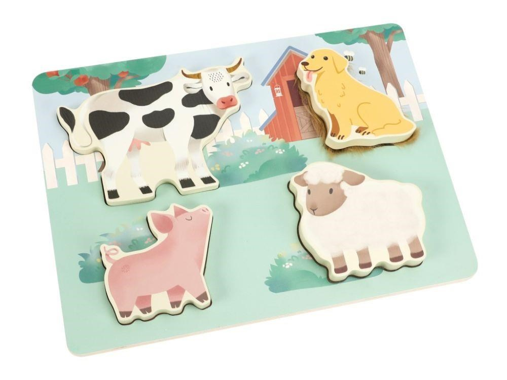 Originálne *drevené vkládacie puzzle* zavedie deti na farmu, zoznámi ich so zvieratkami, ktoré môžu poznať zo svojho okolia aj ich kožuškom. Zvieratká v ich skutočnej podobe dodávajú hre spolu s rôznymi textúrami realistický nádych. Deti pri hre s puzzle zdokonaľujú motorické zručnosti, koordináciu očí a rúk, stimulujú zmysly a učia sa spoznávať zvieratká z farmy.