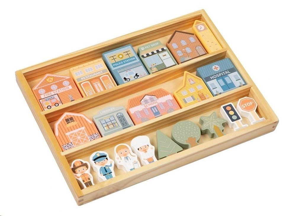 Dřevěné kostky město - domy, postavičky a další doplňky