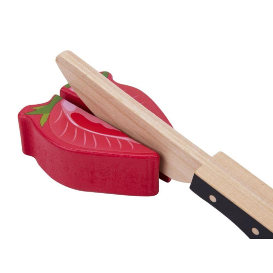Drevené ovocie na krájanie je hračka, ktorá by nemala chýbať v žiadnej detskej kuchynke ani detskom obchode. Táto činnosť je pre deti úplne bezpečná. Polovice ovocia sú spojené suchým zipsom, vďaka čomu deti ľahko ovocie dreveným nožom rozrežú. Balenie obsahuje 9 druhov ovocia, drevenú doštičku aj drevený nôž.