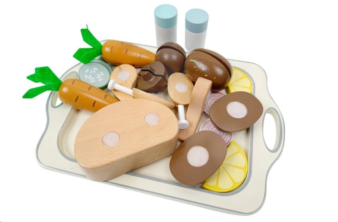 Drevená sada potravín so zeleninou, kurčaťom, solničkou, korením a veľkým podnosom (táckom) je skvelým doplnkom do detskej kuchynky. S touto sadou bude príprava (pečenie) kurčaťa hračkou a veľkou zábavou. Drevené kurča stačí obložiť obľúbenou zeleninou a prílohami, osoliť, okoreniť a vložiť do rúry, ktorá je súčasťou detskej kuchynky vašej dievčatko alebo chlapca. Teraz už len pohlídať, aby sa kurča nespálilo a chutné vyzerajúce jedlo je pripravené na podávanie. S touto originálnou sadou drevených potravín si deti vyskúšajú prípravu obeda bezpečným detským spôsobom, zdokonalia motorické zručnosti a manuálnu zručnosť, pustia uzdu svojej fantázii, pridajú sa do roly kuchára, mamičky, otecka a užijú si veľa zábavy. Na natieranie sa používajú vodou riediteľné farby, vhodné a bezpečné pre deti.