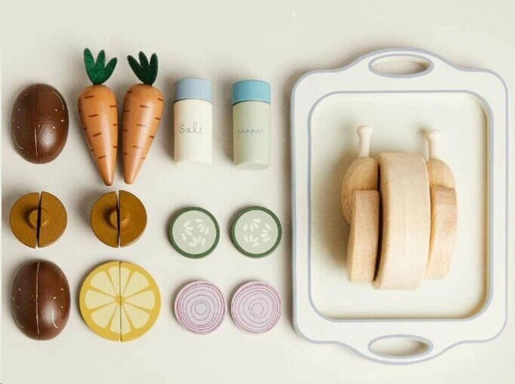 Drevené potraviny, zelenina, kurča, solnička s korením a veľký tác uľahčia deťom varenie a pečenie v detskej kuchynke. S touto drevenou sadou krájacích potravín bude pečenie kurčaťa zábavnou hrou. Stačí ku kurčaťu pridať obľúbenú zeleninu a potraviny, osoliť, okoreniť a vložiť kurča do rúry. Upečené drevené kurča s oblohou na drevenom podnose vyzerá naozaj chutne a je na zahryznutie.