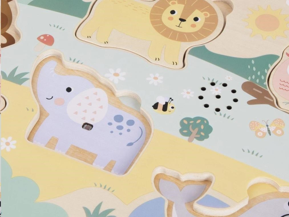 Zvukové drevené vkladacie puzzle so zvieratami zo ZOO prináša deťom zábavu a zdokonaľuje ich zručnosti. Puzzle dieliky v podobe obľúbených zvierat zo ZOO - lev, tiger, slon, lachtan, opička a papagáj pomôžu deťom zdokonaliť motorické zručnosti, koordináciu, predstavivosť, naučia ich rozpoznávať zvieratá a pokojne aj farby, zoznámia ich so zvukmi, ktoré zvieratá vydávajú. Pri hre s vkladacím puzzle deti stimulujú zmysly a musia navyše zapojiť aj svoju myseľ, pretože len správne zvolené a Pootočené zviera krásne zapadne do výrezu v hracej doske.