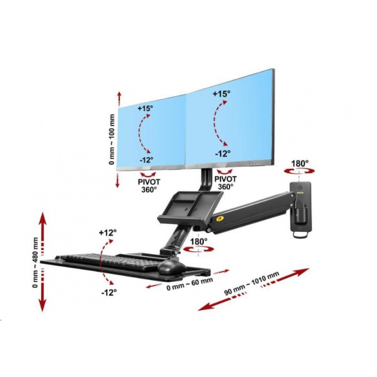 Držiak na 2 monitorov a klávesnicu Fiber Mounts MC27-2AB Profesionálna nástenná pracovná stanica na 2 monitory 17-27" a klávesnicu s myšou Pracovná stanica s nástenným držiakom na 2 monitory (ukotvenie vedľa seba) s policou na klávesnicu a myš. Kompletné nastavenie pozícií monitorov aj police, plná polohovateľnosť - otáčanie, naklápanie, výškové polohovanie, odsadenie od steny. Inštalácia na zvislé povrchy (stena, priečka, stĺpik, pilier, stroje atď.). Najvyššia kvalita, krásny dizajn, ľahká ovládateľnosť - profesionálny výrobok. Farba čierna, záruka 3 roky. Nástenná pracovná stanica s držiakom na 2 monitory a policou na klávesnicu a myš, výškové polohovanie pre prácu v sede i v stoji, otáčanie naklápanie - Fiber Mounts MC27-2AB Technické údaje: minimálne zaťaženie 6kg (kvôli tuhosti plynového piestu) maximálne zaťaženie 12kg ideálny na monitory s uhlopriečkou 17" až 27" nastavenie požadovanej pozície monitorov naklápanie +10° až -15° výškové polohovanie od police 100mm funkcia pivot maximálna vzdialenosť medzi držiakmi monitorov 670mm polohovanie ramena držiaka otáčanie do strán +180°/-180° výškové polohovanie 480mm nastavenie vzdialenosti od steny 90mm (zaklopená polička) až 1010mm polica na klávesnicu s myšou rozmery 560mm x 200mm nastavenie náklonu police +12°/-12° úprava vzdialenosti police od monitorov až 60mm možnosť zaklopenia police na klávesnicu a myš priehradka na dokumenty, poznámky, vizitky, zápisník atď. systém vedenia káblov profesionálne spracovanie, najvyššia kvalita farebné prevedenie čierne záruka 3 roky