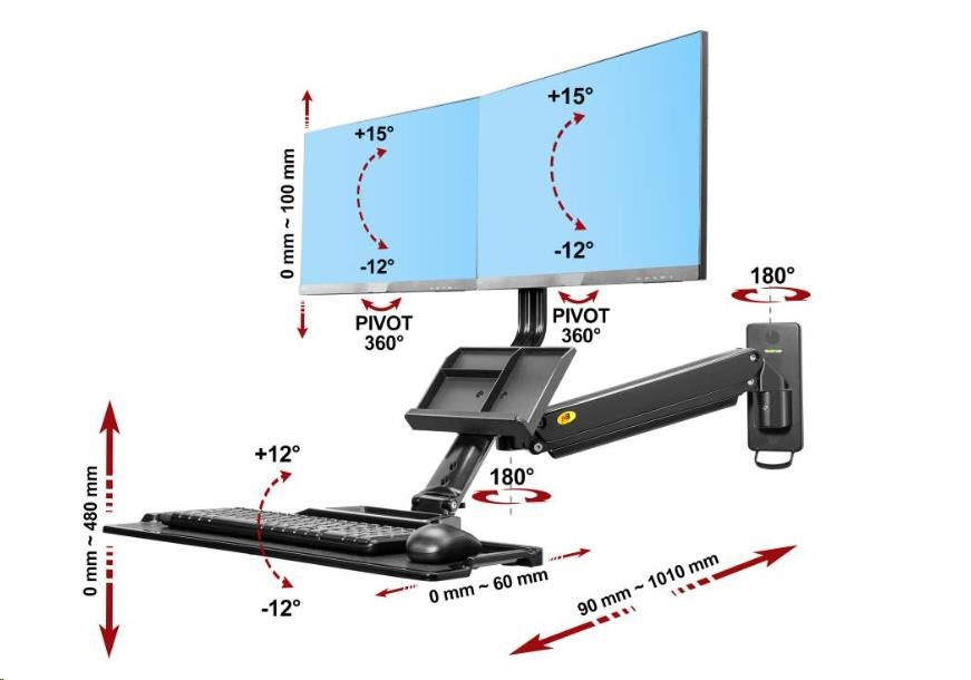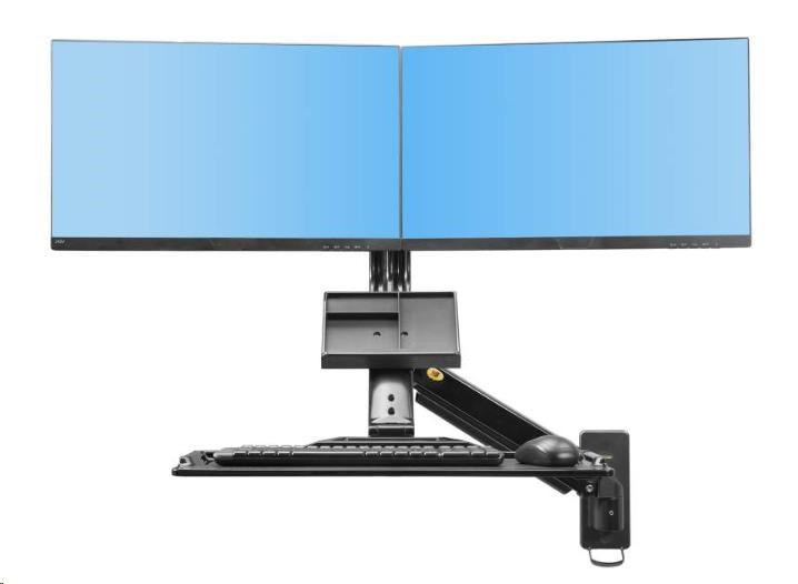 Držiak na 2 monitorov a klávesnicu Fiber Mounts MC27-2AB Profesionálna nástenná pracovná stanica na 2 monitory 17-27" a klávesnicu s myšou Pracovná stanica s nástenným držiakom na 2 monitory (ukotvenie vedľa seba) s policou na klávesnicu a myš. Kompletné nastavenie pozícií monitorov aj police, plná polohovateľnosť - otáčanie, naklápanie, výškové polohovanie, odsadenie od steny. Inštalácia na zvislé povrchy (stena, priečka, stĺpik, pilier, stroje atď.). Najvyššia kvalita, krásny dizajn, ľahká ovládateľnosť - profesionálny výrobok. Farba čierna, záruka 3 roky. Nástenná pracovná stanica s držiakom na 2 monitory a policou na klávesnicu a myš, výškové polohovanie pre prácu v sede i v stoji, otáčanie naklápanie - Fiber Mounts MC27-2AB Technické údaje: minimálne zaťaženie 6kg (kvôli tuhosti plynového piestu) maximálne zaťaženie 12kg ideálny na monitory s uhlopriečkou 17" až 27" nastavenie požadovanej pozície monitorov naklápanie +10° až -15° výškové polohovanie od police 100mm funkcia pivot maximálna vzdialenosť medzi držiakmi monitorov 670mm polohovanie ramena držiaka otáčanie do strán +180°/-180° výškové polohovanie 480mm nastavenie vzdialenosti od steny 90mm (zaklopená polička) až 1010mm polica na klávesnicu s myšou rozmery 560mm x 200mm nastavenie náklonu police +12°/-12° úprava vzdialenosti police od monitorov až 60mm možnosť zaklopenia police na klávesnicu a myš priehradka na dokumenty, poznámky, vizitky, zápisník atď. systém vedenia káblov profesionálne spracovanie, najvyššia kvalita farebné prevedenie čierne záruka 3 roky