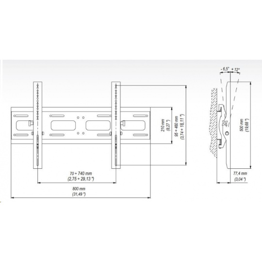 Technické údaje: doporučená veľkosť TV 42" - 63" nosnosť TV držiaka 80kg vzdialenosť od steny 77mm náklon TV +6,5° / -12° VESA štandard 100x100 až 740x460mm profesionálna konštrukcia zaistenie TV proti pádu certifikovaný náklopný držiak jednoduchá inštalácia záruka 10 rokov DRŽIAK PODPORUJE VESA ŠTANDARDY: VESA 100x100 VESA 200x100 VESA 200x200 VESA 300x200 VESA 300x300 VESA 400x200 VESA 400x300 VESA 400x400 VESA 600x400 všetky atypické rozmery VESA štandardov až do rozmerov 700x460mm