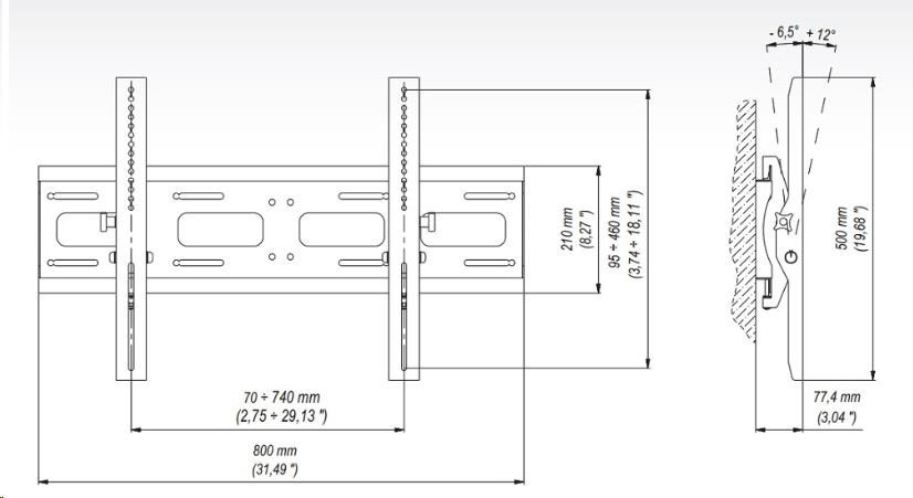Technické údaje: doporučená veľkosť TV 42" - 63" nosnosť TV držiaka 80kg vzdialenosť od steny 77mm náklon TV +6,5° / -12° VESA štandard 100x100 až 740x460mm profesionálna konštrukcia zaistenie TV proti pádu certifikovaný náklopný držiak jednoduchá inštalácia záruka 10 rokov DRŽIAK PODPORUJE VESA ŠTANDARDY: VESA 100x100 VESA 200x100 VESA 200x200 VESA 300x200 VESA 300x300 VESA 400x200 VESA 400x300 VESA 400x400 VESA 600x400 všetky atypické rozmery VESA štandardov až do rozmerov 700x460mm