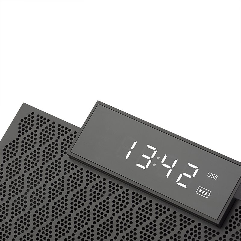 Reproduktor je vybavený veľkým, dobre čitateľným displejom, ktorý vám poskytne niektoré z najdôležitejších informácií. Teraz môžete skontrolovať čas alebo úroveň batérie len pohľadom! A čo viac, vďaka špeciálnym senzorom sa jas obrazovky neustále prispôsobuje prostrediu. Displej môžete tiež úplne vypnúť stlačením tlačidla – nemusíte sa báť príliš jasného svetla, ktoré vás v noci udrží hore!