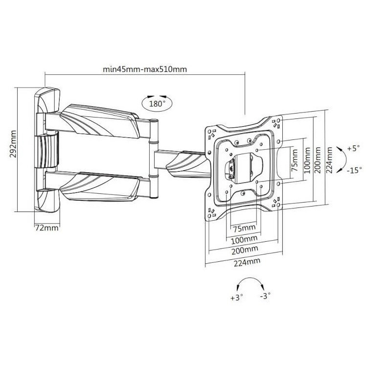 Elegantný plne nastaviteľný Držiak na TV Fiber Mounts DF4 Držiak na TV od 23" do 55", otáčanie do strán +/-90°, naklápanie +5°/-15°, vysúvací 45-510mm, korekcia roviny +/-3°, VESA štandard 75x75 až 200x200, krytky na káblovanie, nosnosť 35kg, záruka 5 rokov Ak chcete zavesiť televízor na naozaj kvalitný televízny držiak a nepretratiť majlant, tak do svojho výberu určite zahrňte držiak Fiber Mounts DF4. Kvalitný televízny držiak, ktorý je elegantný a pritom má veľmi pevnú a spoľahlivú konštrukciu. Zaviesť môžete televízory s uhlopriečkou 23-55", ktoré majú hmotnosť až 35kg. Tv držiak DF4 podporuje VESA štandardy 75x75 až 200x200, má systém na ukrytie káblovania, inštaláciu uľahčí možnosť korekcie roviny obrazovky. Farebné prevedenie čierne, záruka 5 rokov. Elegantný televízny držiak s veľmi pevnou, robustnou konštrukciou. Jednoduché polohovanie televízie, vysúvací, otáčateľný, sklopný, korekcia roviny, ukrytie káblovania, TOP kvalita a dizajn, nízka cena držiaku - Fiber Mounts DF4 Technické údaje: maximálne zaťaženie 35kg na televízory aj monitory s uhlopriečkou 23-55" podporuje VESA štandardy 75x75 až 200x200 výsuvný od steny 45 mm až 510 mm otáčanie TV na obe strany +/- 90° naklápanie TV nahor až 5°, nadol až 15° korekcia roviny obrazovky +/- 3° dizajnové krytky na ukrytie káblovania silnostenná oceľová konštrukcia v elegantnom prevedení veľmi jednoduché polohovanie televízie jednoduchá a rýchla inštalácia farebné prevedenie čierne záruka 5 rokov Veľmi pevná a robustná konštrukcia, pritom televízny držiak Fiber Mounts DF4 pôsobí a vyzerá veľmi elegantne Jednoduchá inštalácia televízneho držiaku Fiber Mounts DF4 na stenu, do rohov miestností, na pilier a stĺpy Elegantný televízny držiak Fiber Mounts DF4 podporuje VESA štandardy: VESA 75x75 VESA 100x100 VESA 200x100 VESA 200x200 Na TV držiak Fiber Mounts DF4 môžete zaviesť všetky značky, typy a veľkosti televízorov, ktoré majú hmotnosť maximálne 35kg a ktoré podporujú ktorýkoľvek z vyššie uvedených VESA štandardov. Veľkosť televízora nie je podstatná.