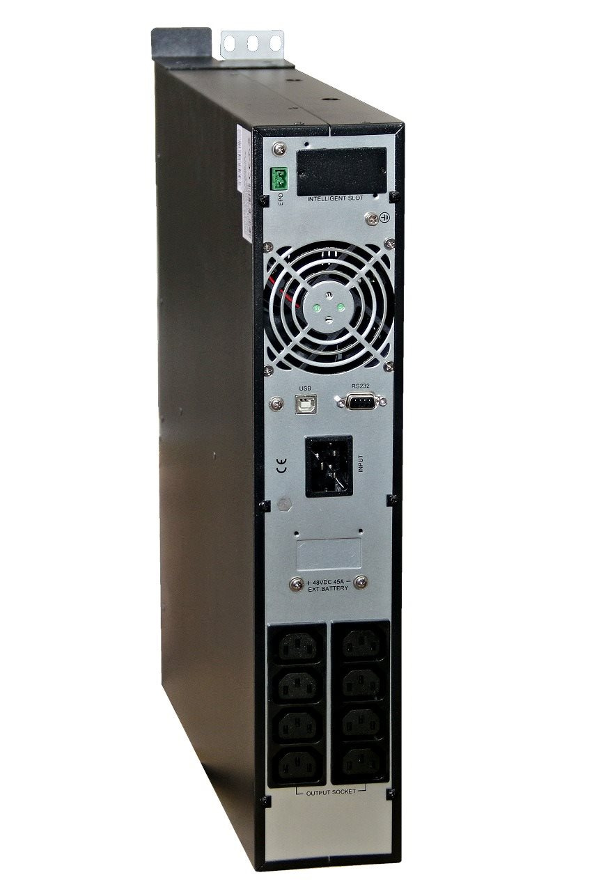 Online záložný zdroj EA902PRT so sínusovým výstupom. Rozmerovo navrhnutý pre serverové aplikácie (montáž do 19" racku). Súčasťou balenia sú plastové podstavce na vertikálne umiestnenie. 3 ovládacie tlačidlá a informačný displej na prednom paneli.