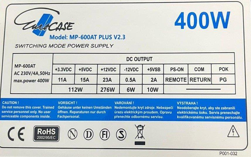 Napájací zdroj ATX značky Eurocase s výkonom 400W. Je osadený 120mm ventilátorom a pasívnym PFC (Power factor correction). Otáčky ventilátora sú riadené teplotnou reguláciou. Zdroj spĺňa požiadavky na elektrickú bezpečnosť a elektromagnetickú kompatibilitu. Zdroj vyhovuje aj smernici 2005/32/EÚ = príkon v pohotovostnom režime.