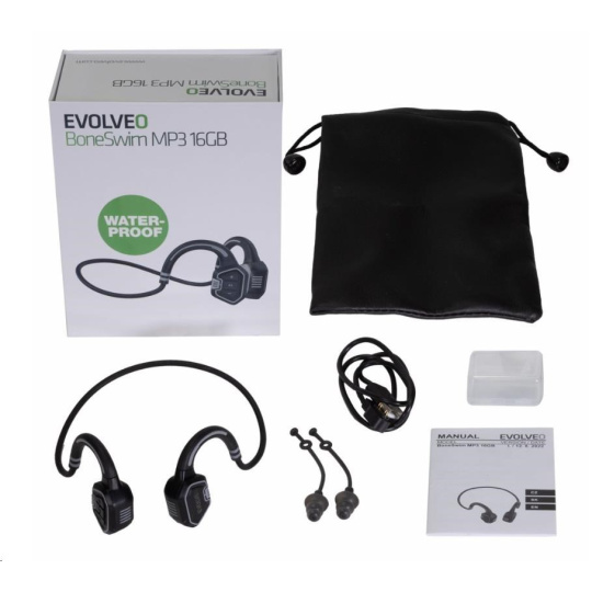 | Obsah balenia | EVOLVEO BoneSwim MP3 slúchadlá Ochranný prenosný obal Magnetický napájací kábel Ucpávky do uší v krabičke + uchytenie Užívateľský manuál |