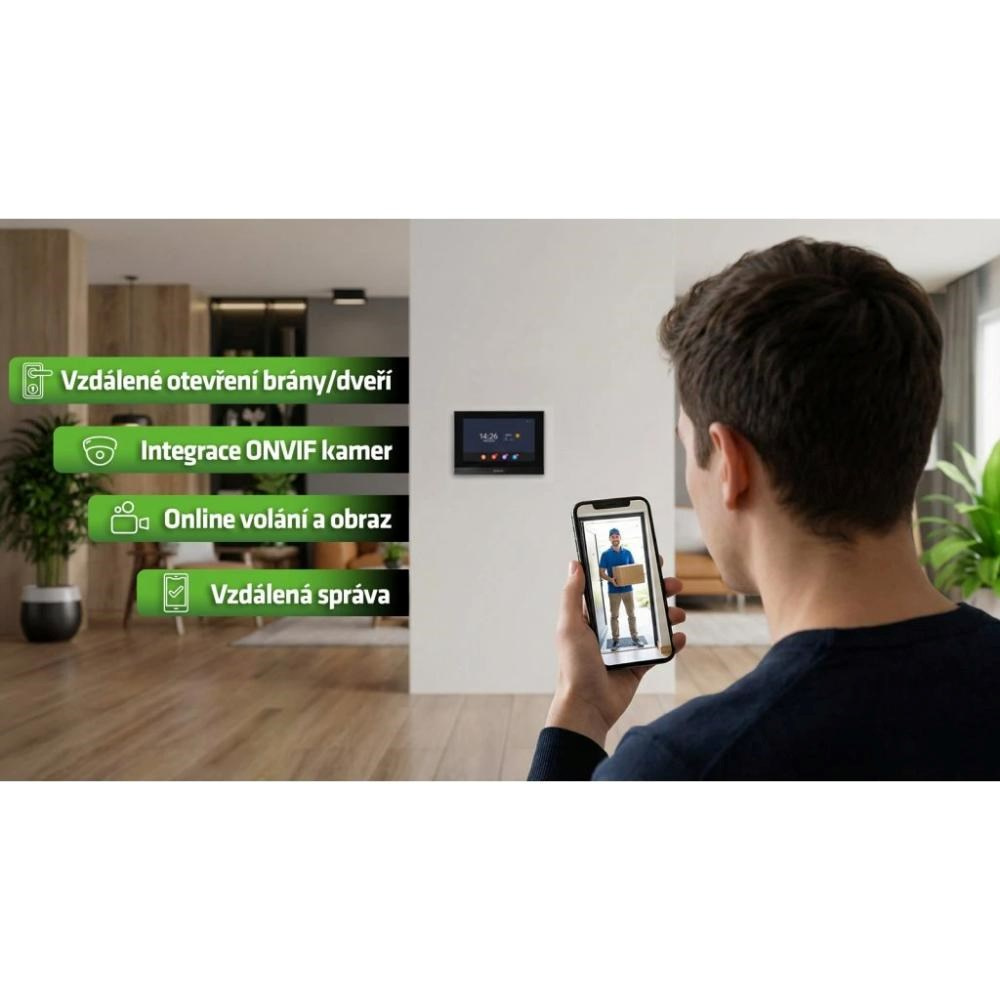 Interiérová jednotka není jen pasivní obrazovka. Dominantou systému je 7" barevný dotykový monitor, který funguje jako centrum komunikace u vstupu do domu a zároveň jako elegantní součást interiéru.