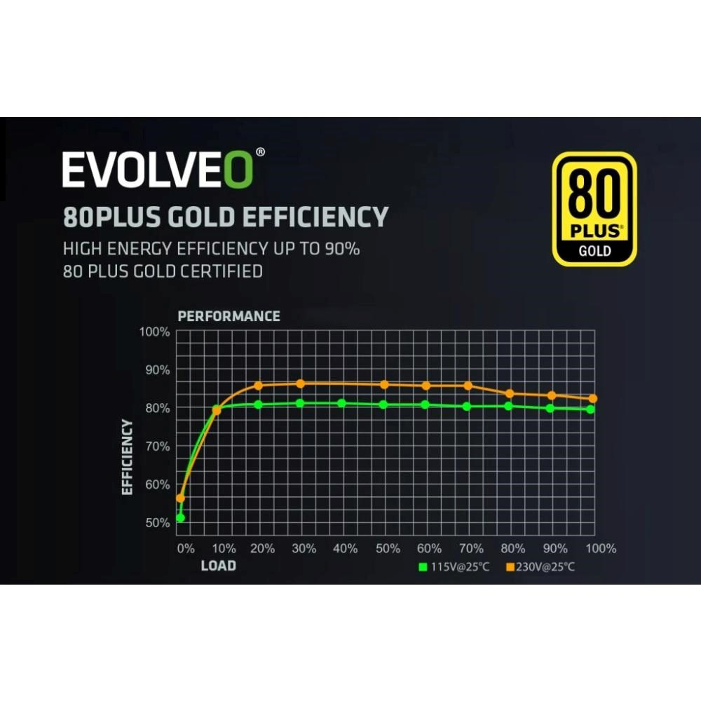 PC zdroj EVOLVEO G650-BK je hrdým držiteľom certifikácie 80 PLUS Gold, ktorá sľubuje až 92% účinnosť (pri bežnom 50% zaťažení). Minimálne straty energie a nízke zahrievanie idú ruka v ruke s tichým chodom 140mm HDB ventilátora – ten má medzi hriadeľom a ložiskami špeciálnu olejovú vrstvu a jeho trenie je nepatrné, takže hlučnosť zostáva na minime. S týmto zdrojom vás jednoducho nebude rušiť hučanie ventilátora – počujete iba zvuk kolies vašej formule alebo zvuk zbraní vašej armády.