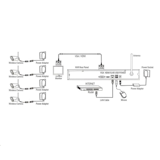 | Obsah balenia | NVR jednotka s 8 kanálmi, SATA pripojením pre až 8TB disk 4x Bezdrôtová Bullet IP66 kamera s nočným prísvitom 4x Anténa pre bezdrôtovú kameru 2,4G 5dB 1x napájací adaptér DC 12V 2A pre NVR 4x napájací adaptér pre kamery 4x sada pre upevnenie kamery 4x bajonetová tesniaca krytka pre RJ45 konektor 1x Anténa pre NVR jednotku 1x USB myš 1x SATA kábel pre pripojenie HDD 1x Používateľský manuál |