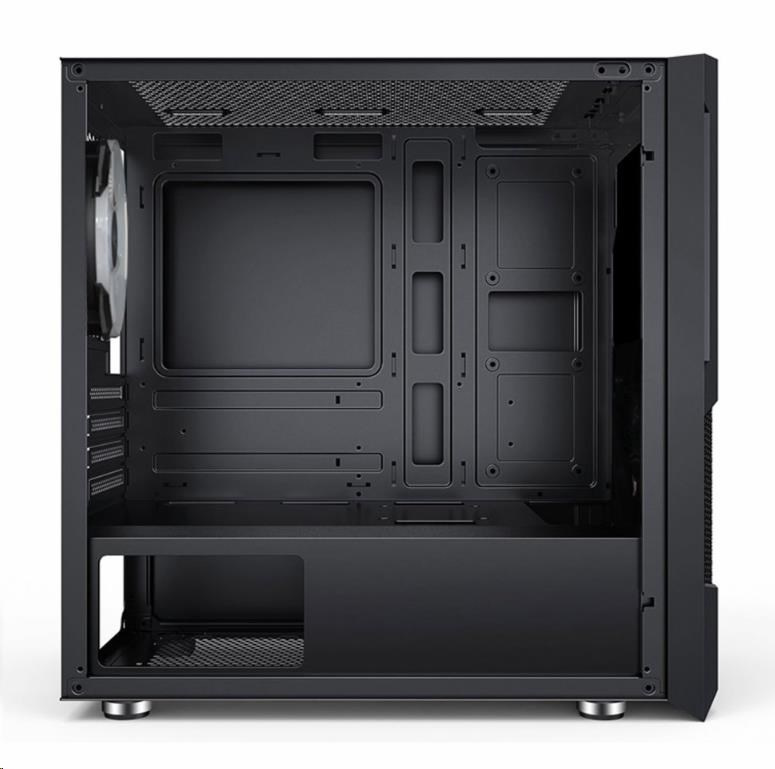 Herné mATX skrinka s inštalovanými RGB rainbow 120 mm ventilátormi a bočnicou z temperovaného skla. Skrinka je určená pre základné dosky podporujúce platformu Intel aj AMD. Okrem formátu mATX je kompatibilná aj s formátom Mini ITX. Zdroj je umiestnený v spodnej časti skrinky. Spodná mriežka je osadená vysúvacím prachovým filtrom. Ovládanie ventilátorov je možné pomocou pripojenia ku základnej doske.