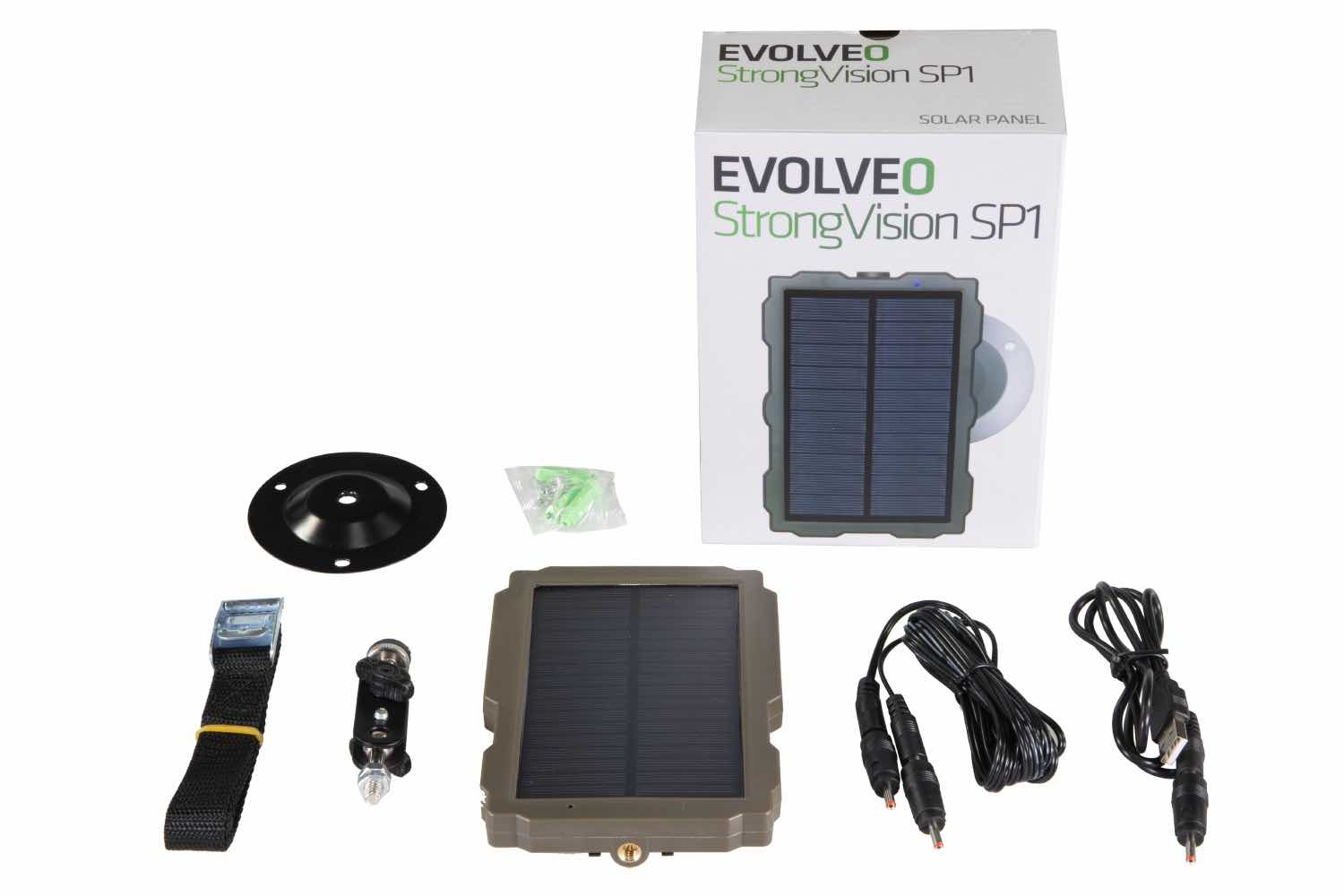 Solárny panel určený na napájanie fotopascí EVOLVEO StrongVison. Solárny panel obsahuje vestavenú 1500mAh batériu, ktorá slúži v čase, keď nie je dostatočná slnečná energia na prevádzku pripojených zariadení. U fotopascí EVOLVEO StrongVision nedochádza k nabíjaniu batérií fotopasti, solárny panel slúži v tomto prípade ako nezávislý zdroj napájania a batéria fotopasti ako záložný zdroj napájania