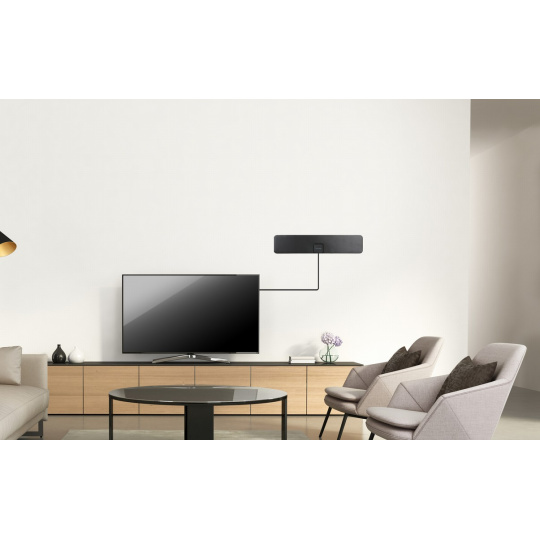 Elegantná vnútorná anténa na príjem digitálnej aj analógovej TV. Zosilňovač antény je možné napájať dvoma spôsobmi vďaka USB káblu. Napájanie pomocou adaptéra 230V a ďalej napájanie z USB konektora. Druhý spôsob ocení používateľ, ktorý chce sledovať TV napríklad na NB pomocou USB tunera. Anténu je možné prilepiť sadu 3M obojstranných pásikov na stenu, nábytok alebo umiestniť do podstavca.