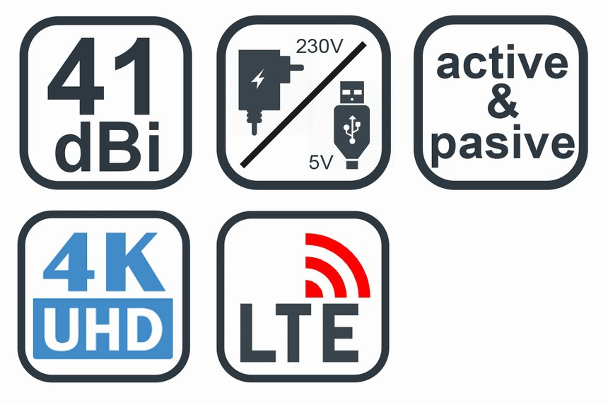 Elegantná izbová anténa na príjem digitálnej aj analógovej TV. Zosilňovač antény je možné napájať dvoma spôsobmi pomocou USB kábla. Napájanie pomocou adaptéra 230V a tiež napájanie z USB konektora. Druhý spôsob ocení používateľ, ktorý chce sledovať TV napríklad na NB pomocou USB tuneru. Anténu je možné prilepiť sadou 3M obojstranných lepiacich pásikov na stenu, nábytok, alebo umiestniť do podstavca. Podstavec je vybavený prísavkou.